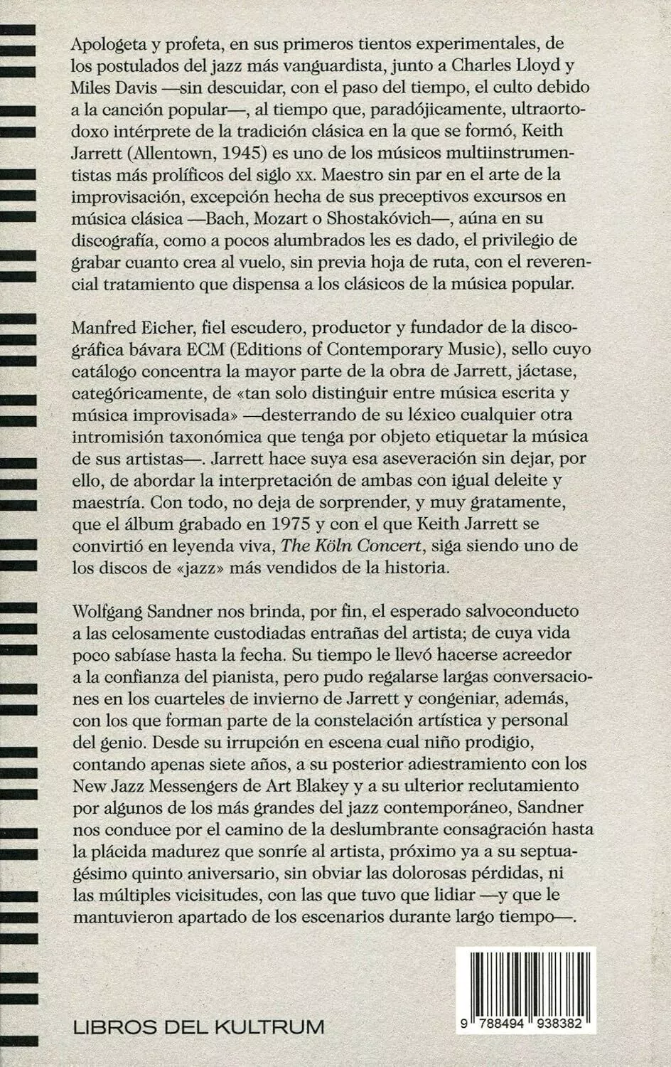 Primera y única biografía traducida al español del gran pianista Keith Jarrett. La única biografía actualizada y autorizada por el artista. Wolfgang Sandner nos brinda el esperado salvoconducto a las celosamente custodiadas entrañas del artista.